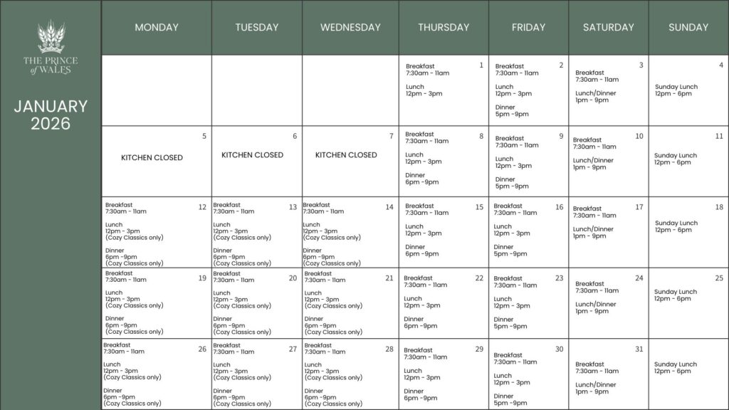 During January we will be running a slightly reduced kitchen service. We want to give our kitchen staff a chance to recuperate during our quiet time. Here is our calendar of opening times. Our kitchen will be closed for a deep clean for just a few days at the beginning of Jan on the 5th 6th and 7th. Then during Jan from Mon – Wed we will be running a Cosy Classics reduced menu. We are so excited for what 2026 has in store at the Prince and look forward to all the events we have planned.